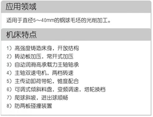 本機床采用臥式布局和循環加工方式。主機床身重約5000kg,內部加強筋布局合理,以提高強度,機床耐沖擊性和抗變形能力增強。主機與主傳動分離,料盤采用傾斜方式,料盤的旋轉采用交流變頻調速。進球口處增加爬球坡道,直接從料盤切線處進球。加壓方式采用液壓驅動,蓄能器保壓裝置。通過改變雙速電機的極數可得到主軸兩檔轉速。