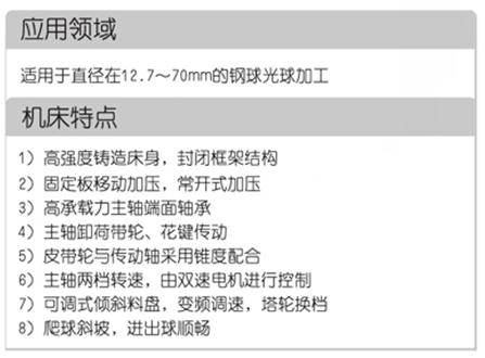 (1) 本機床采用臥式布局和循環加工方式。主機為了強化整體剛性,采用整體封閉框架式鑄造結構,剛性好,精度高且保持性好。輸球料盤采用傾斜式料盤,變頻無級調速。料盤與尾架接盤使用可調式鉸鏈聯接,調整方便。油缸采用液壓驅動加壓,蓄能器保壓機構,保壓穩定可靠。主軸轉速由雙速電機進行控制。機床尾架導向桿采用由微型油泵組成的潤滑系統,安全可靠。
