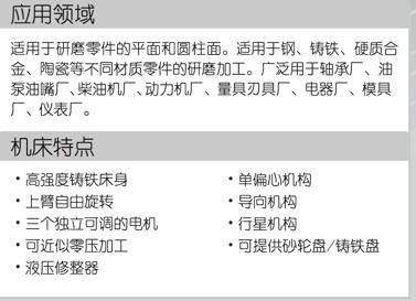 機床備有液壓修整器、單偏心機構、導向機構和行星機構。根據特殊訂貨要求可供應砂輪盤。